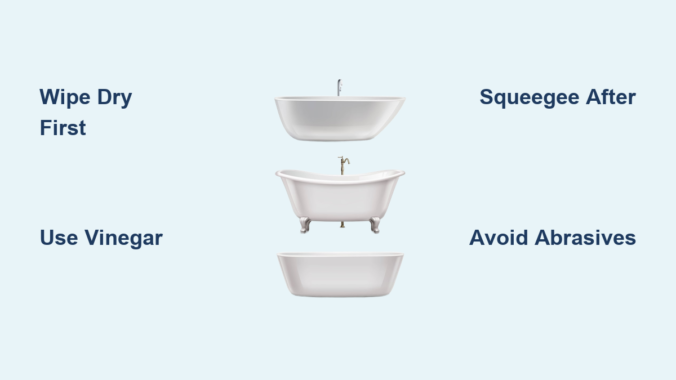 – Squeegee habit: Wipe walls and tub immediately after exiting (takes 15 seconds)